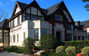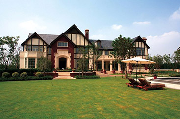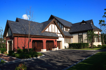 英式建筑的主要特征為雙坡陡屋面、深檐口、外露木構架、磚砌底腳等。屋面高低錯落,色彩以青灰色為主,外墻材料多采用紅磚,配以木飾,細密的窗戶分格、精美的雕刻欄桿,體現出英式別墅考究、細膩的特質。