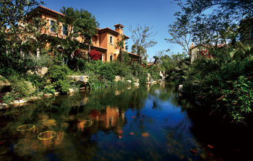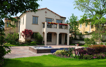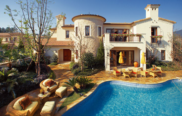 西班牙建筑形體自由活潑,屋頂層次起伏,出檐較淺,有大大小小的露臺、鐵藝欄桿等立面元素,外墻采用淺色調抹灰。